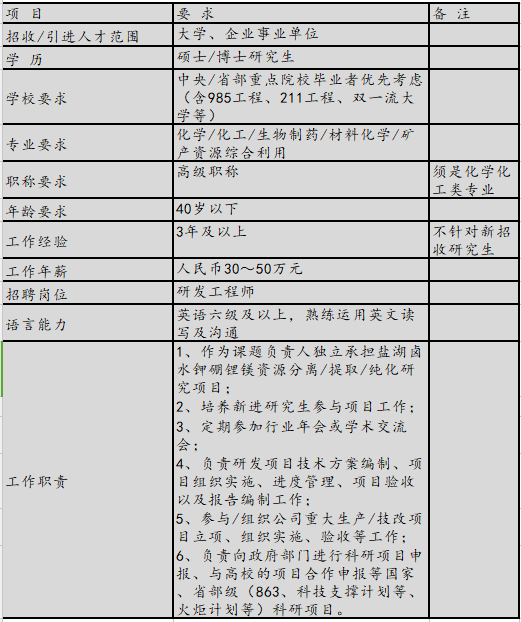 锂事业发展部关于招收研发工程师的具体要求: