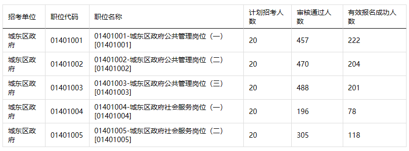 2019年城东区招聘基层公共管理和社会服务岗位工作人员考试报名情况统计表已出,截止至10月16日9时报名审核通过人数已高达1916人,有效报名成功人数823人!