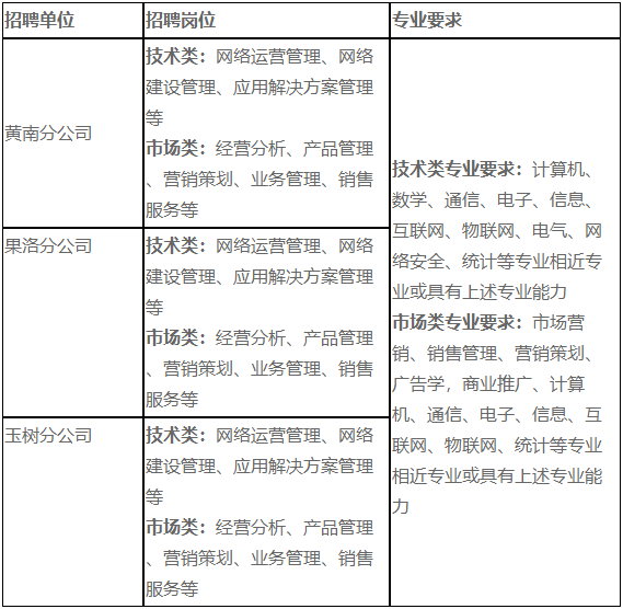 因公司业务发展需要,中国移动青海公司黄南、果洛、玉树分公司现面向2020年应届毕业生对技术、市场等岗位进行招聘,具体如下: