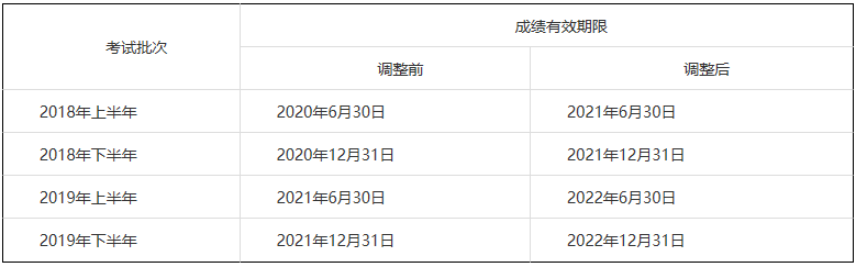 参加“2018年上半年至2019年下半年”各批次笔试,已通过的单科笔试科目成绩有效期延长1年,即成绩有效期由2年延长至3年,成绩查询网站页面会及时更新有效期限。参加“2017年下半年批次(含)之前”单科笔试科目成绩有效期已于2019年12月31日前终止,因此不再延长。(延长批次详见下表)