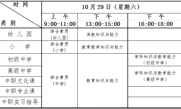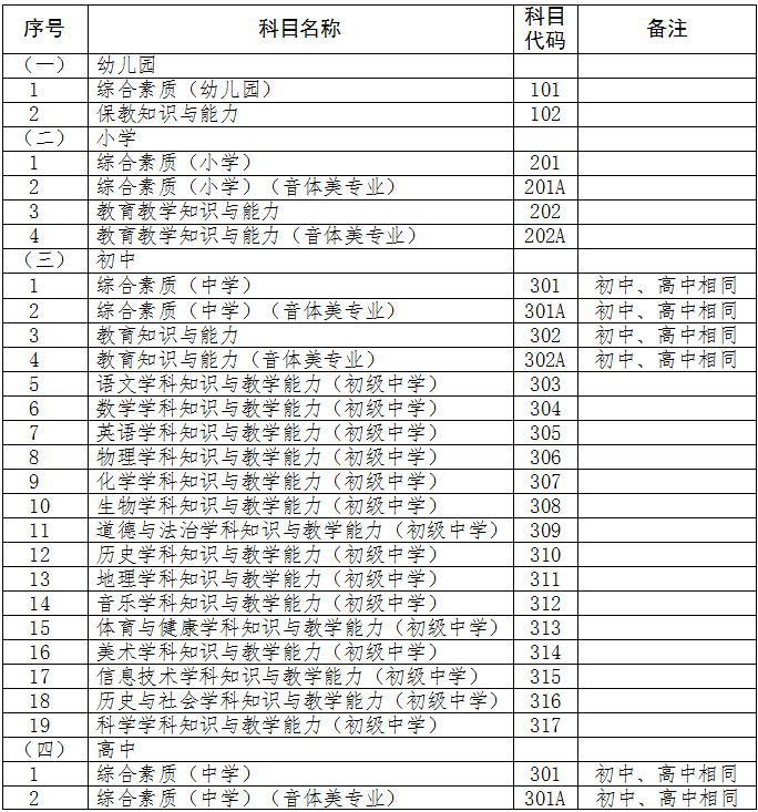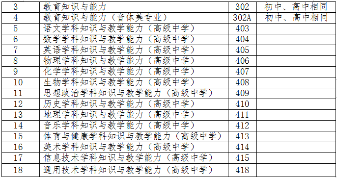 注:1.初级中学学科知识与教学能力科目为:语文、数学、英语、物理、化学、生物、道德与法治、历史、地理、音乐、体育与健康、美术、信息技术、历史与社会、科学等15个学科。