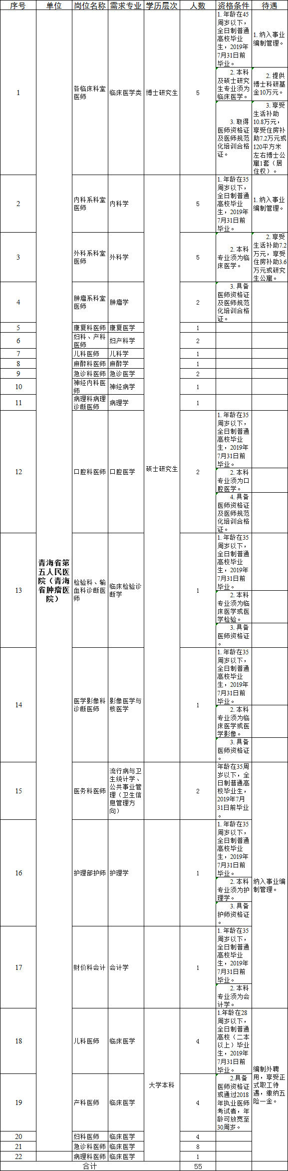 根据我院专业技术人员缺员情况和医院发展需要,计划招聘各类专业人员55名,其中编内招聘34人,编外招聘21人,详见《青海省第五人民医院(青海省肿瘤医院)公开招聘高层次紧缺人才计划表》。