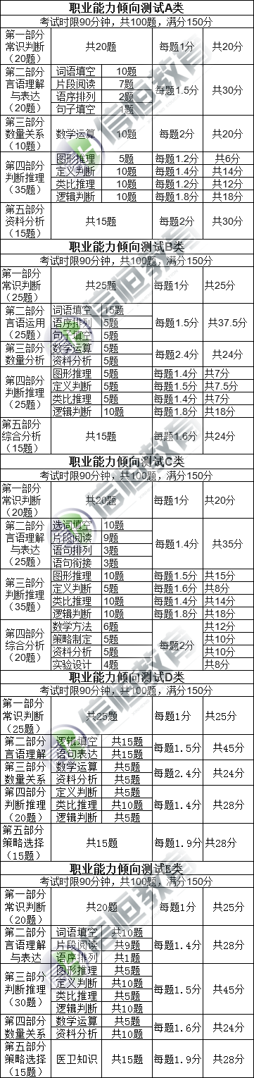 2018年青海事业单位考试ABCDE类职业能力倾向测验各模块分值如下: