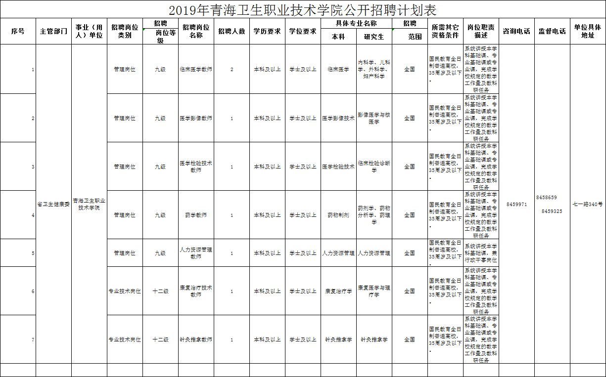 为充实我院教职工队伍,优化师资队伍结构,青海卫生职业技术学院现面向社会公开招聘教师。根据《2019年全省事业单位工作人员招聘总体方案》(青政办〔2019〕31号)规定,结合学院实际,制订2019年公开招聘工作人员方案,经省人社厅审核备案,现将有关事项公布如下。