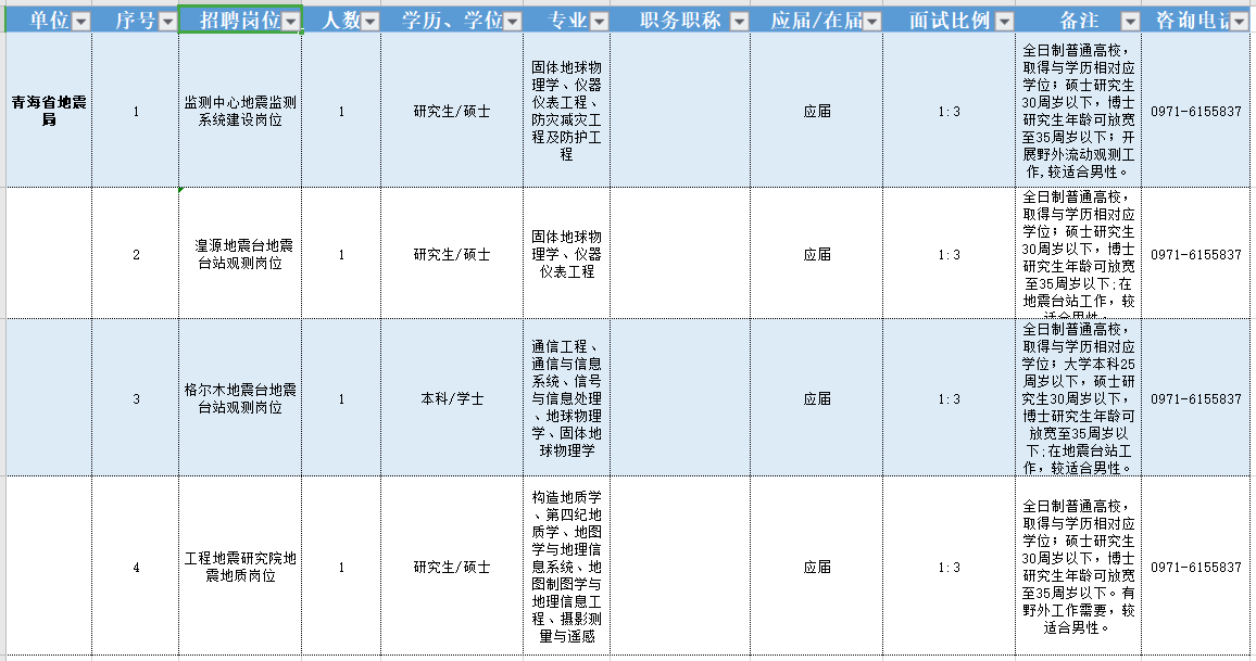 招聘岗位、人数、条件详见《2020年度中国地震局局属单位事业人员公开招聘岗位信息表》(附件1)。岗位要求的学历、学位、职称等均为最低资格条件。
