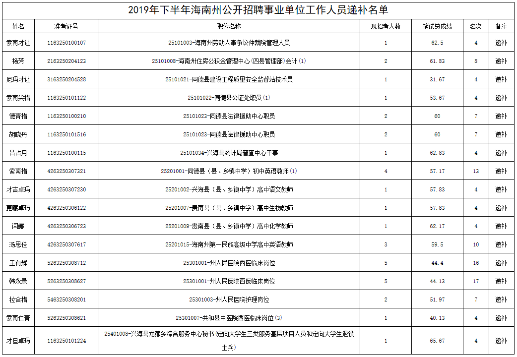附:2019年下半年海南州面向社会公开招聘事业单位工作人员进入现场资格审查递补人员名单