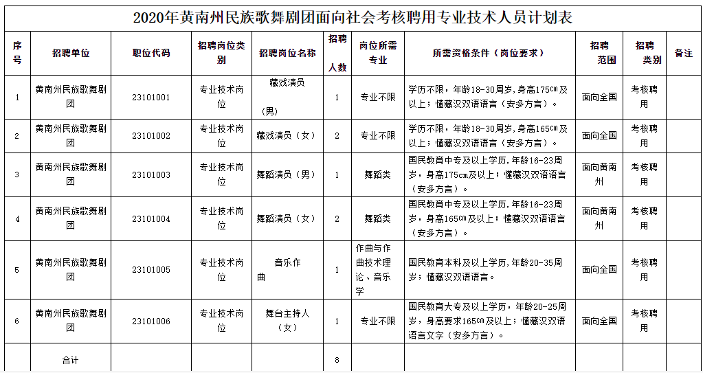 本次招聘采取考核聘用方式,共招聘专业技术人员8名,其中:藏戏演员3名,舞蹈演员3名,音乐作曲1名,舞台主持人1名,详见附表。