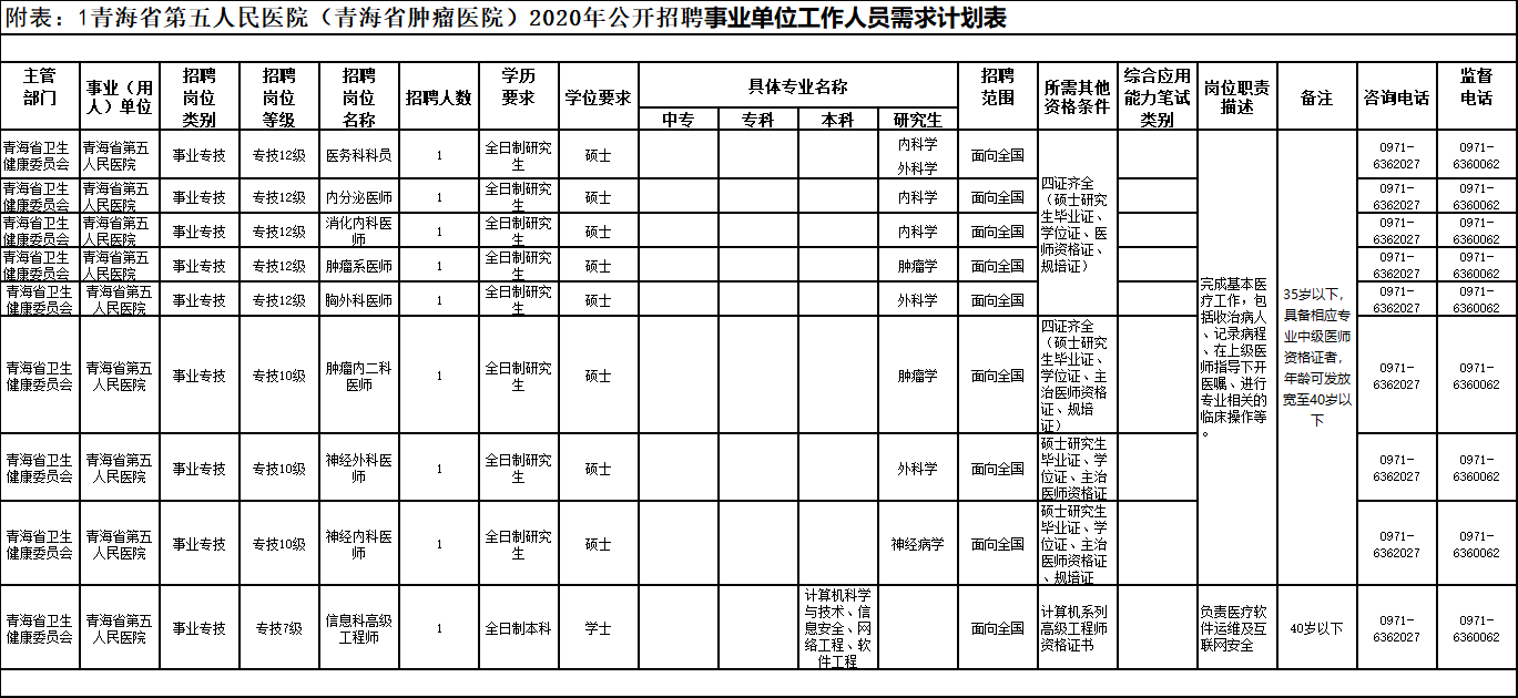 附表1:《青海省第五人民医院(青海省肿瘤医院)2020年公开招聘事业单位工作人员需求计划表》