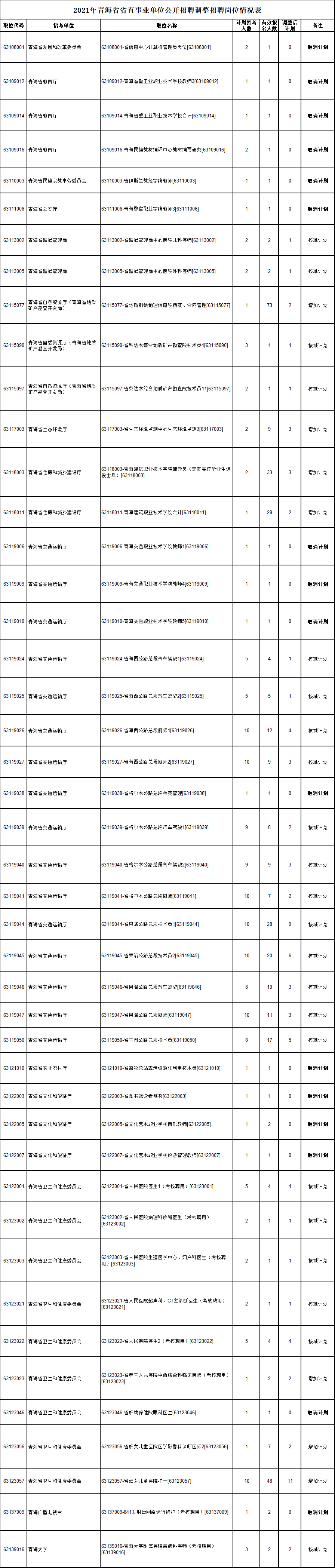 根据《2021年青海省省直事业单位面向社会公开招聘工作人员公告》等有关规定,部分岗位招聘人数与报名人数达不到1:3比例的,根据用人单位及主管部门意见,将取消、核减或调整部分岗位的招聘数额(具体取消、核减或增加情况见附表),其中招聘岗位无人报考的自动取消。请报考岗位被取消的考生与原报考单位联系改报事宜,改报只限一次,不改报的考生将视为放弃报考资格。招聘岗位已核减的考生不允许改报。