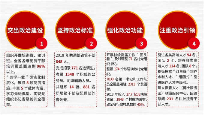 党的十九大以来,在省委的坚强领导和中央组织部的有力指导下,全省各级组织部门认真践行新时代党的组织路线,坚持把政治建设贯穿始终,围绕中心、服务大局,担当尽责、克难攻坚,持续推动组织工作高质量发展。