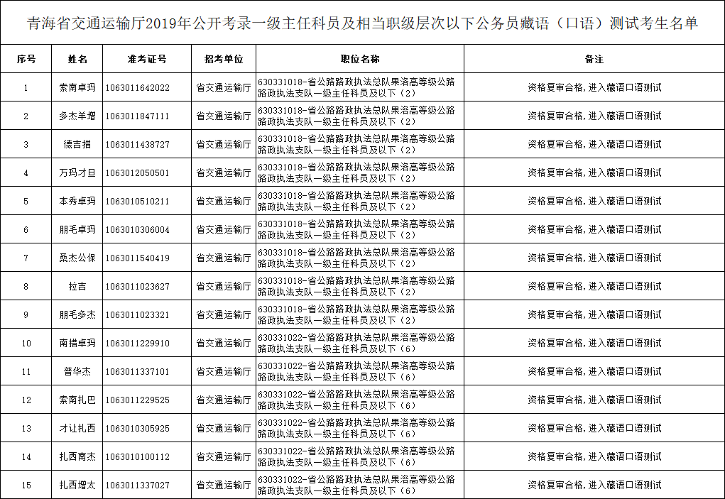 附件:青海省交通运输厅2019年公开考录一级主任科员及相当职级层次以下公务员藏语(口语)测试考生名单