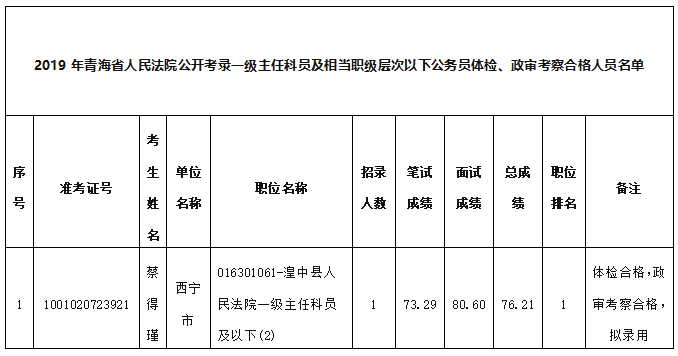 附件:2019年青海省人民法院公开考录一级主任科员及相当职级层次以下公务员体检、政审考察合格人员名单