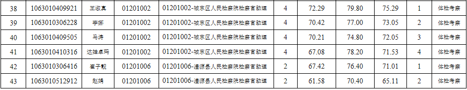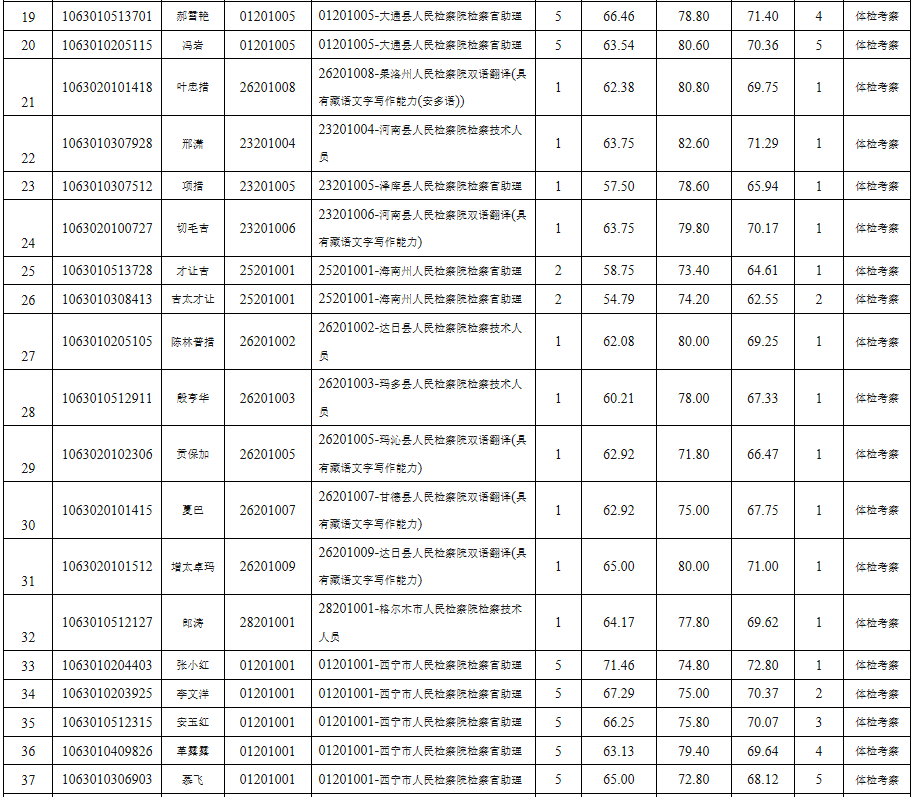 按照《青海省2019年人民法院、人民检察院公开考录一级主任科员及相当职级层次以下司法辅助人员(公务员)总成绩公示》,报考人民检察院,进入体检考察环节的考生。(名单附后)