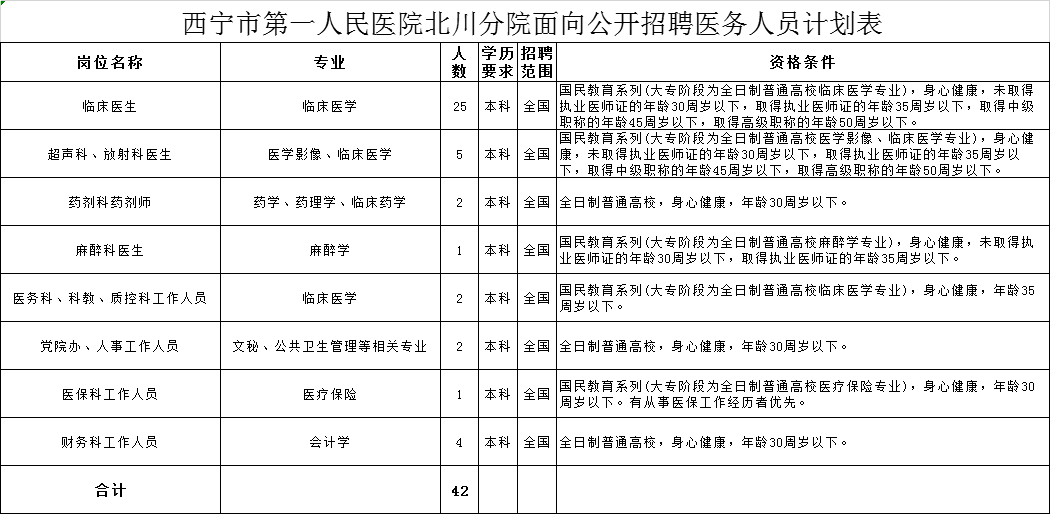 西宁市第一人民医院新建北川分院(拟建成集医疗、教学、科研和预防保健为一体的综合性二级甲等医院),位于西宁市宁张公路75号、距西宁24公里处的青铝生活区,将于2019年9月投入使用,拟面向社会公开招聘42名编外同工同酬工作人员,北川分院解决职工住宿,并有往返西宁的通勤车。现将有关事项公告如下。