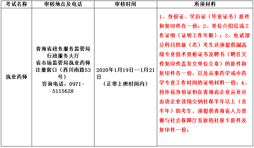 根据《司法部关于印发开展证明事项告知承诺制试点工作方案的通知》(司发通〔2019〕54号)、《人力资源社会保障部办公厅关于印发<人力资源社会保障系统开展证明事项告知承诺制试点工作实施方案>的通知》(人社厅发〔2019〕71号)及《人力资源社会保障部人事考试中心关于印发<专业技术人员资格考试报名证明事项告知承诺制试点工作实施方案>的通知》(人考中心函〔2019〕26号)的规定和要求,现要求青海省2019年度执业药师资格考试成绩合格人员必须进行现场考后复核,既现场审核资格条件,共374人(名单见附件)。