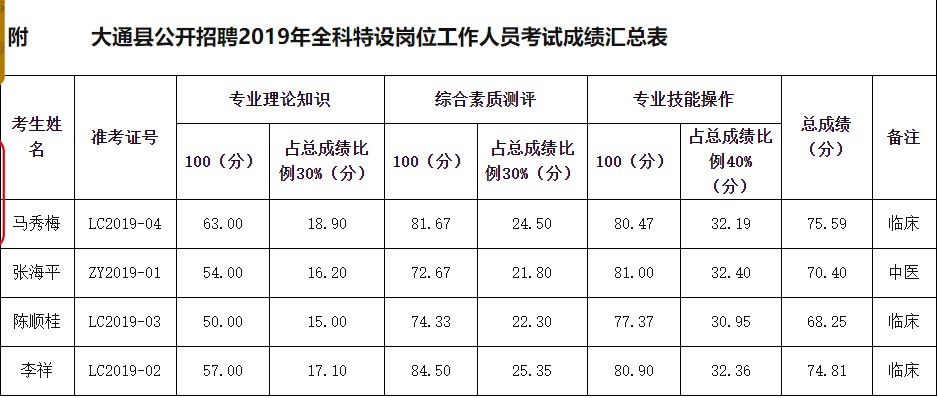 根据《关于印发西宁市全科医生特设岗位计划试点实施方案的通知》(宁卫健基妇[2019]286号)和《大通县公开招聘全科医生特设岗位工作人员考试工作方案》规定,大通县公开招聘2019年特岗全科医生工作于2020年4月3日完成了专业知识考试、综合素质及专业技能操作考核。现将考试结果予以公示,具体见附表《大通县公开招聘2019年全科特设岗位工作人员考试成绩汇总表》。