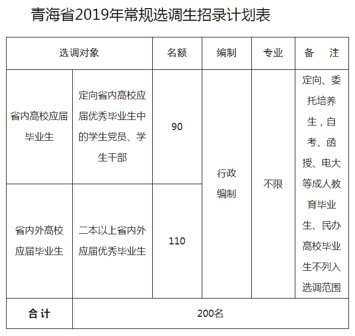 1.定向选调生90名。从省内三所高校(青海大学、青海师范大学、青海民族大学)应届毕业生中的学生党员、学生干部中定向选调90名(每校30名),由各高校党委严格遴选、认真把关后推荐产生初步人选,统一安排参加选调生考试、体检、考察后按成绩择优录用。