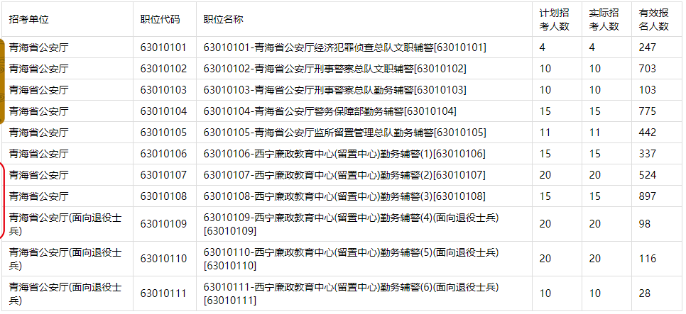 竞争最热岗位是青海省公安厅—63010108—西宁廉政教育中心(留置中心)勤务辅警(3),计划招录15人,最终有效报名人数达897人,竞争比1:59.8。