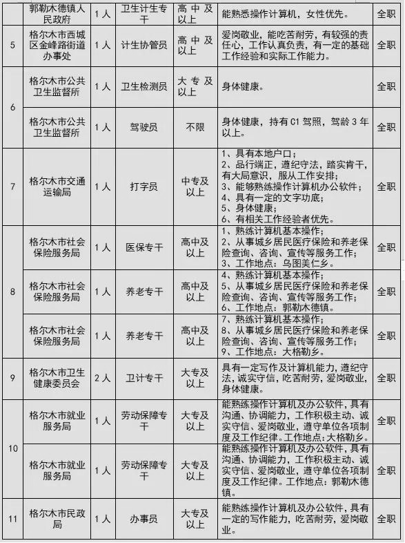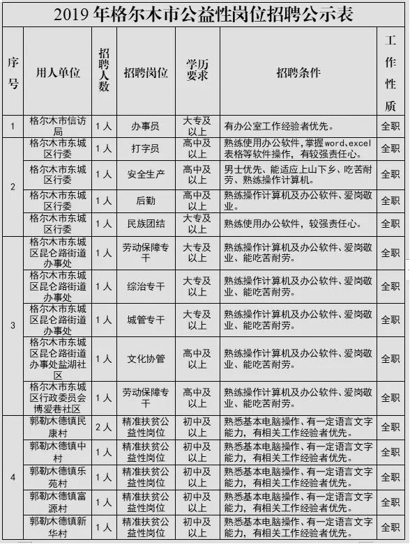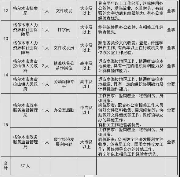 根据《青海省公益性岗位开发管理办法》等相关政策规定,结合格尔木市公益性岗位实际工作需求,现面向全市公开招聘公益性岗位工作人员37名,现将有关事宜公告如下: