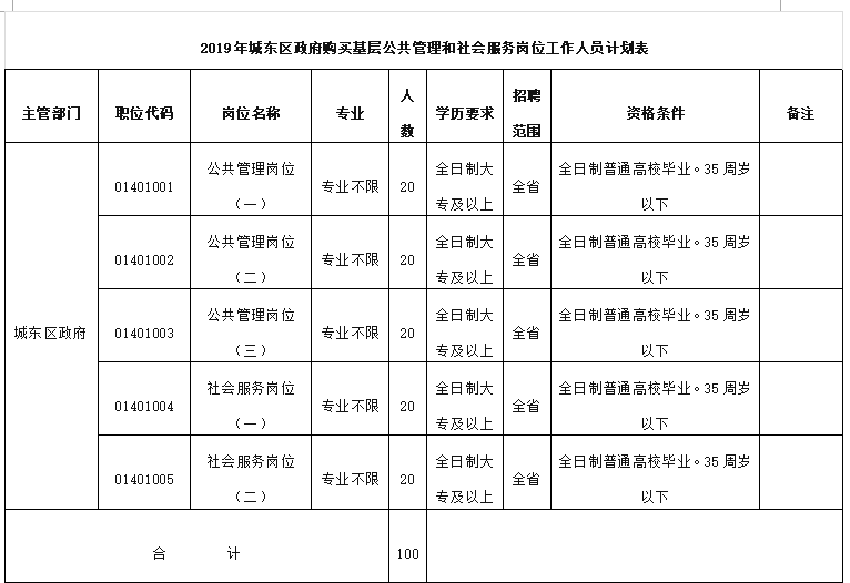 附件:2019年城东区政府购买基层公共管理和社会服务岗位工作人员计划表