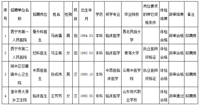 根据《青海省事业单位公开招聘工作人员办法》(青人社厅发[2015]80号)和《2019年西宁市医疗卫生机构面向社会公开招聘医务人员公告》规定,2019年西宁市医疗卫生系统面向社会公开招聘工作人员递补考生体检、考察(政审)工作已结束,现将马尚福等4名拟聘用人员进行公示,公示期为2019年10月17日至10月23日。公示期间,如对拟聘用人员有异议,请以来电或书面形式反映,反映情况时应署真实姓名和联系方式,匿名反映不予受理。公示期满后,请拟聘用人员持本人身份证于10月24日上班时间前往市卫生健康委或县区人社局报到。