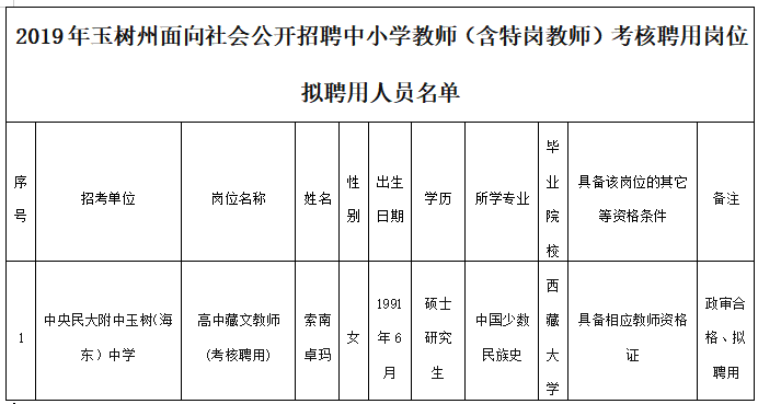 附1:《2019年玉树州面向社会公开招聘中小学教师(含特岗教师)拟聘用人员名单》