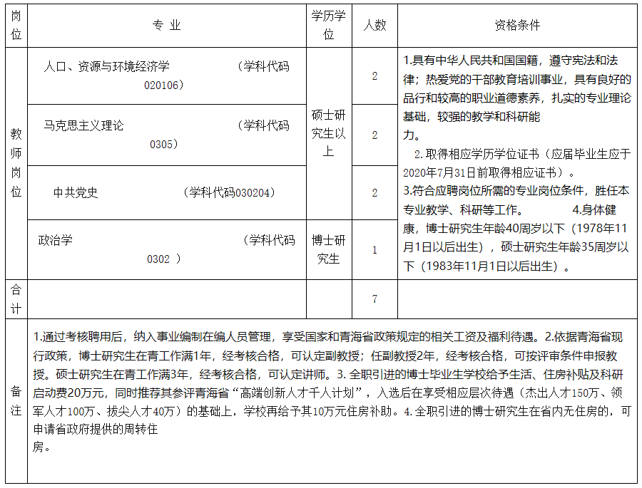 中共青海省委党校面向社会公开招聘7名教师,具体招聘岗位及条件见《中共青海省委党校公开招聘高层次紧缺人才计划表》(附后)