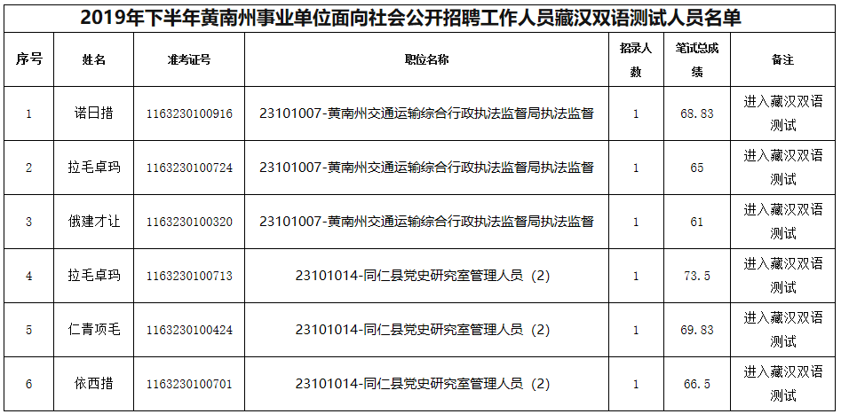 报考2019年下半年黄南州事业单位面向社会公开招聘工作人员藏汉双语岗位且已通过现场资格审查的考生(名单附后)。