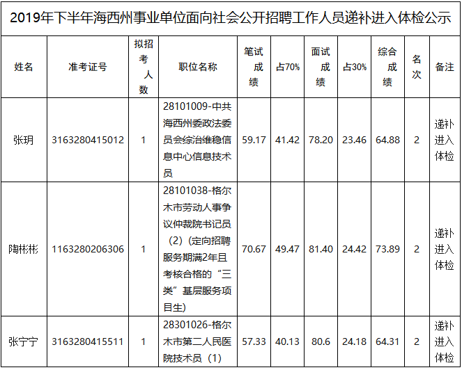 附:2019年下半年海西州事业单位面向社会公开招聘工作人员递补进入体检人员名单