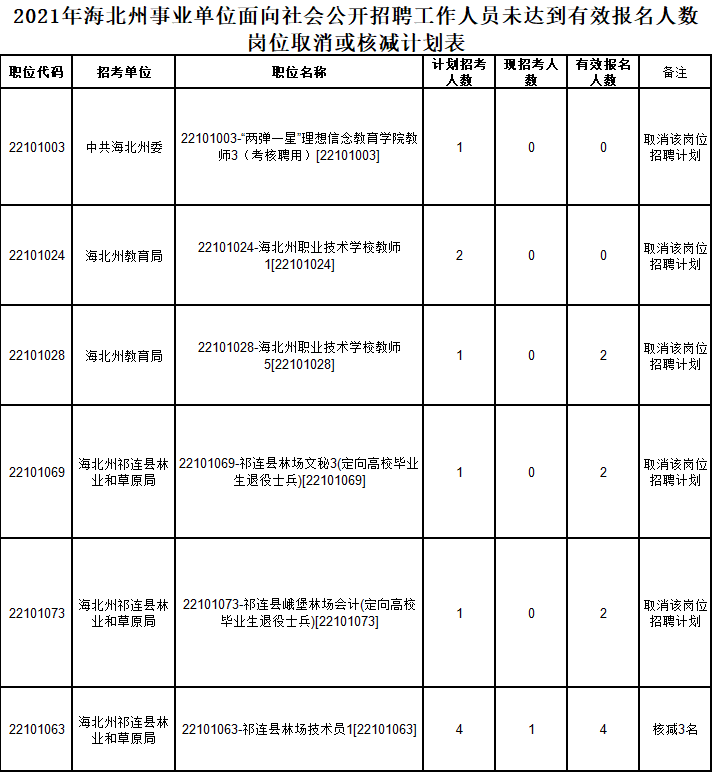 根据《2021年海北州面向社会公开招聘事业单位工作人员公告》规定,经海北州事业单位面向社会公开招聘工作领导小组办公室研究决定,对未达到有效报名人数岗位调整招聘计划,现将相关岗位公布,考生在规定时间内(2021年4月30日下午16:00时前)进行报名岗位调剂,考生不同意调剂或无符合报考条件岗位的退还报名费;对核减招聘计划的,正常进行考试。