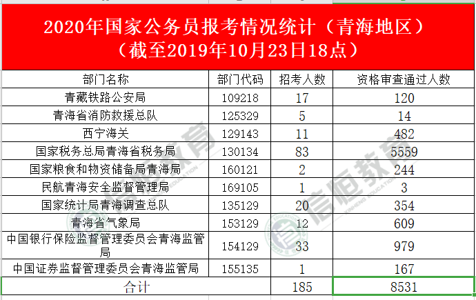 2020年国家公务员考试(青海地区)共招录185名,截至2019年10月23日18点资格审查通过人数8531人,最热职位是青海省气象局—153129—青海省西宁市气象局—计划财务科财务管理一级科员及以下—400110002002,最高竞争比是1:202。