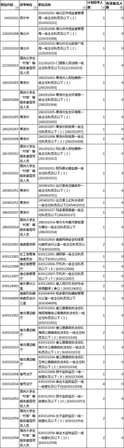 2019年青海公务员考试笔试共招聘822名,报名第4天青海公务员考试有效报名人数14660人 ,30个岗位无有效报名人数,最高竞争比为201:1,2019年全省公开考录一级主任科员及相当职级层次以下公务员共822名。具体考录职位计划请登录青海省人事考试信息网(www.qhpta.com)查询。