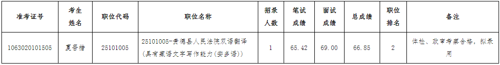 根据《青海省2019年人民法院、人民检察院公开考录一级主任科员及相当职级层次以下司法辅助人员(公务员)公告》要求,现对人民法院公开考录一级主任科员及相当职级层次以下司法辅助人员递补考生夏吾措体检、政审考察结果进行公示,公示期为2020年4月15日至4月21日(节假日除外)。公示期间如有异议,可通过来电、来信、来访等形式,署名进行实事求是、客观公正的反映。