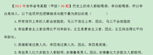历史上的诗人都能喝酒,也就是说所有历史上的诗人都是爱喝酒的,李白能喝酒,李白是爱喝酒的,所以李白是诗人,那对应起来,用字母来表示文字信息,也就是所有A是B,C是B,所以C是A。